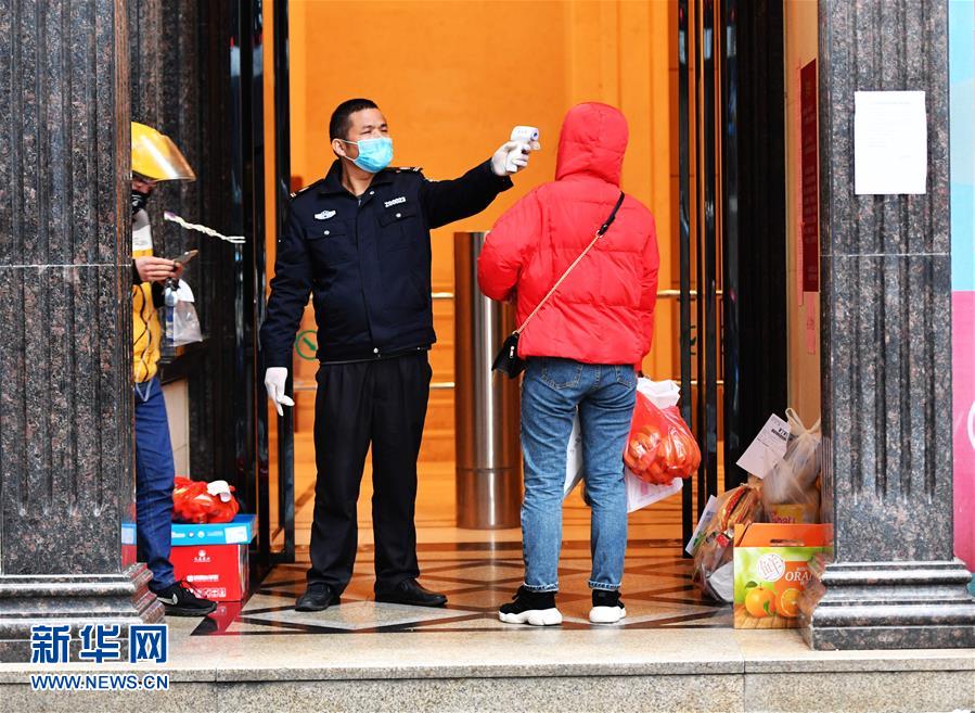 2月6日,在莆田市区的一处住宅小区入口,保安对进入小区的业主进行体温检测。 连日来,福建省莆田市充分发挥基层党组织战斗堡垒作用和广大党员的先锋模范作用,群防群治,严密开展排查工作。目前,防疫排查工作重点是排查来自疫情发生地区的返乡务工人员等,并以农村和社区为重点区域,逐村逐户逐人持续开展“拉网式”排查,确保不漏一户、不漏一人。 新华社记者 魏培全 摄