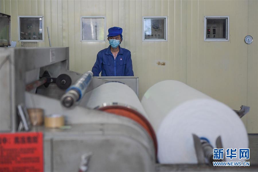2月6日,海南澄迈欣龙控股公司工人在熔喷无纺布车间生产过滤无纺布。 为助力抗击新型冠状病毒感染的肺炎疫情,位于海南澄迈县的欣龙控股公司生产用于口罩细菌过滤的熔喷无纺布车间2020年春节无休,至今24小时运转,以保障对下游口罩生产厂家的原材料供给。 新华社发(蒲晓旭 摄)