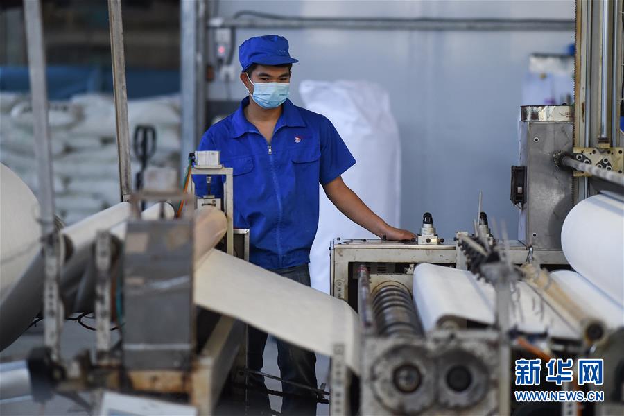 2月6日,海南澄迈欣龙控股公司工人在熔喷无纺布车间裁切生产出的过滤无纺布。 为助力抗击新型冠状病毒感染的肺炎疫情,位于海南澄迈县的欣龙控股公司生产用于口罩细菌过滤的熔喷无纺布车间2020年春节无休,至今24小时运转,以保障对下游口罩生产厂家的原材料供给。 新华社发(蒲晓旭 摄)