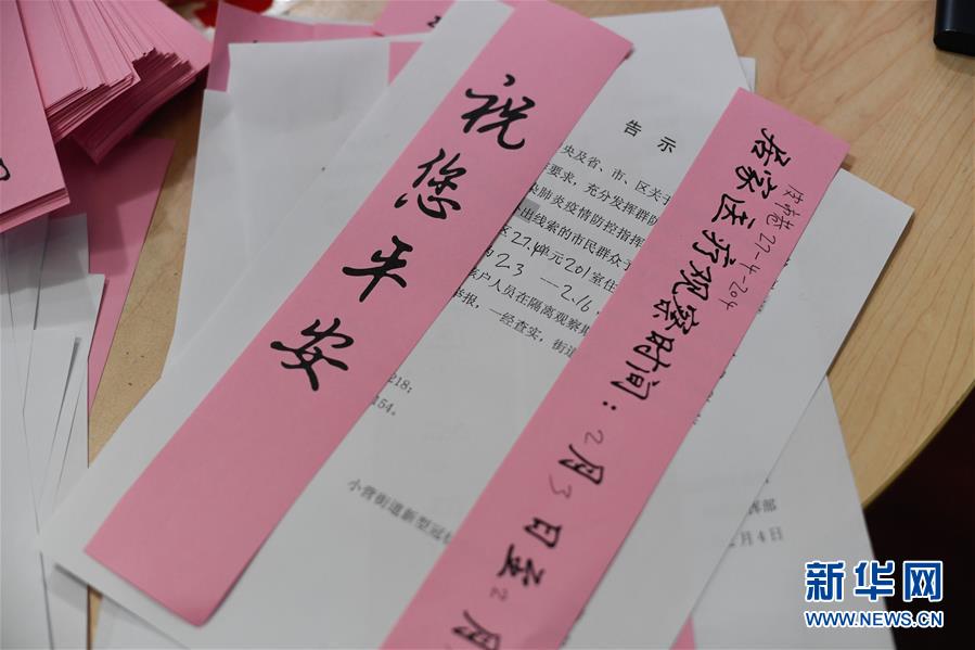2月6日拍摄的小营巷社区工作人员填写的居家隔离住户的告知书。目前,社区有26户居民处于居家隔离阶段。 新型冠状病毒感染的肺炎疫情发生以来,浙江省杭州市上城区小营街道小营巷社区的工作人员一直坚守岗位,广泛组织动员基层力量,为防控疫情尽职尽责,默默守护着城市中心这个拥有3661户居民的社区。 2月4日,杭州市人民政府宣布实施“防控疫情 人人有责”十项举措。全市所有村庄、小区、单位实行封闭式管理,非涉及居民生活必需的公共场所一律关闭,除特殊需要外,倡导每户家庭每两天指派1名家庭成员外出采购生活物资。 新华社记者 黄宗治 摄