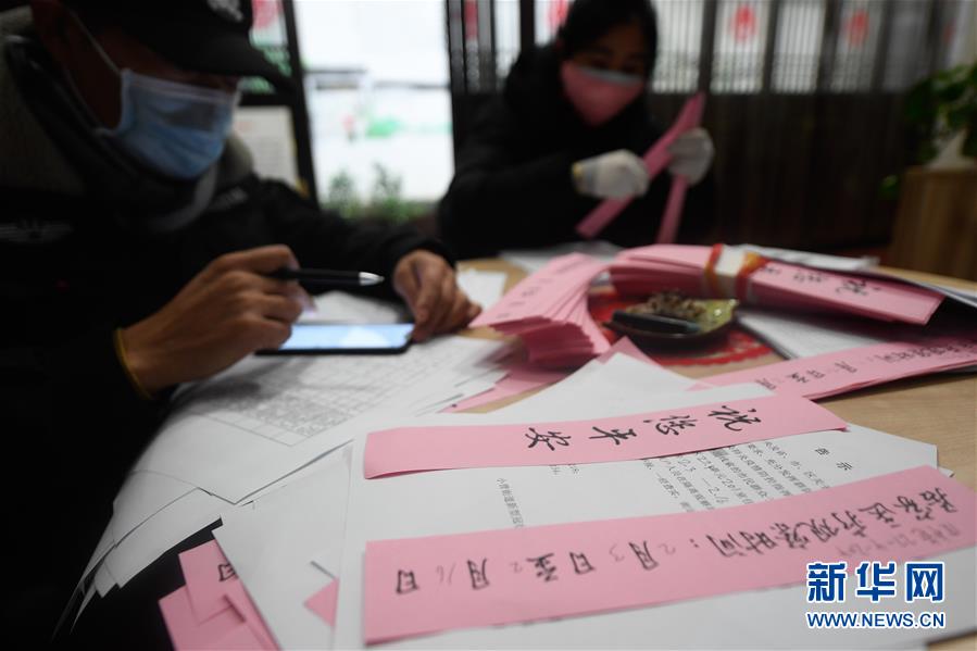 2月6日,小营巷社区工作人员填写居家隔离住户的告知书。目前,社区有26户居民处于居家隔离阶段。 新型冠状病毒感染的肺炎疫情发生以来,浙江省杭州市上城区小营街道小营巷社区的工作人员一直坚守岗位,广泛组织动员基层力量,为防控疫情尽职尽责,默默守护着城市中心这个拥有3661户居民的社区。 2月4日,杭州市人民政府宣布实施“防控疫情 人人有责”十项举措。全市所有村庄、小区、单位实行封闭式管理,非涉及居民生活必需的公共场所一律关闭,除特殊需要外,倡导每户家庭每两天指派1名家庭成员外出采购生活物资。 新华社记者 黄宗治 摄
