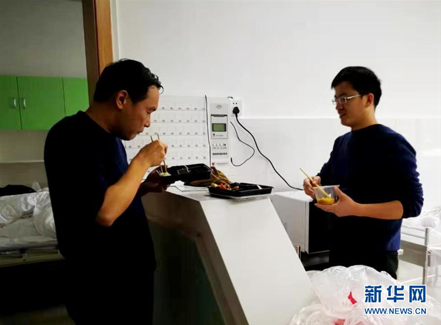 2月6日,隔离病房医护人员在食用午餐。 新华社发(郝源 摄)