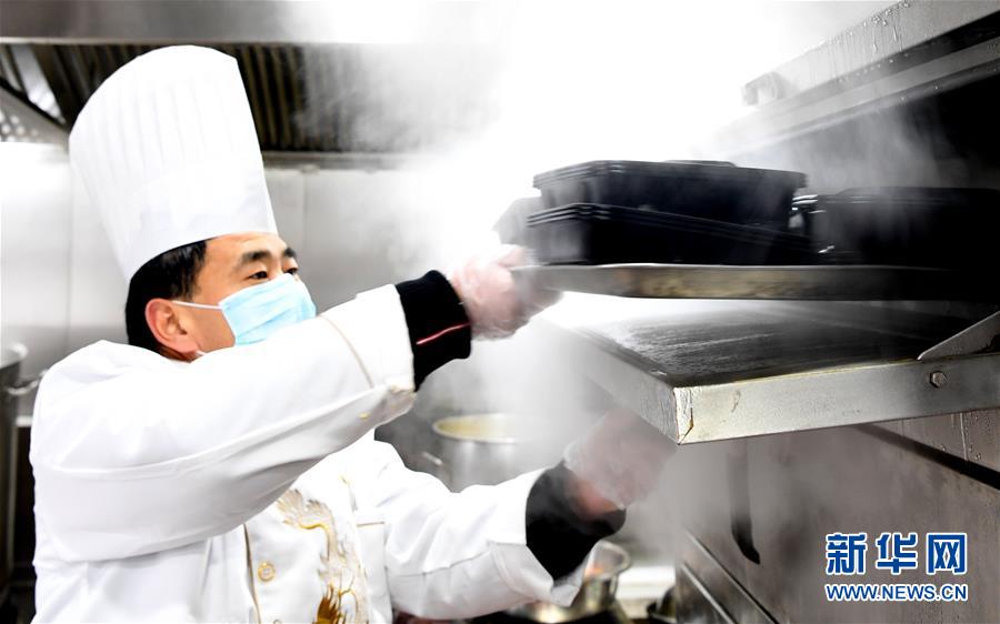 2月6日,厨房工作人员准备对餐盒进行高温消毒。 新华社发(郝源 摄)