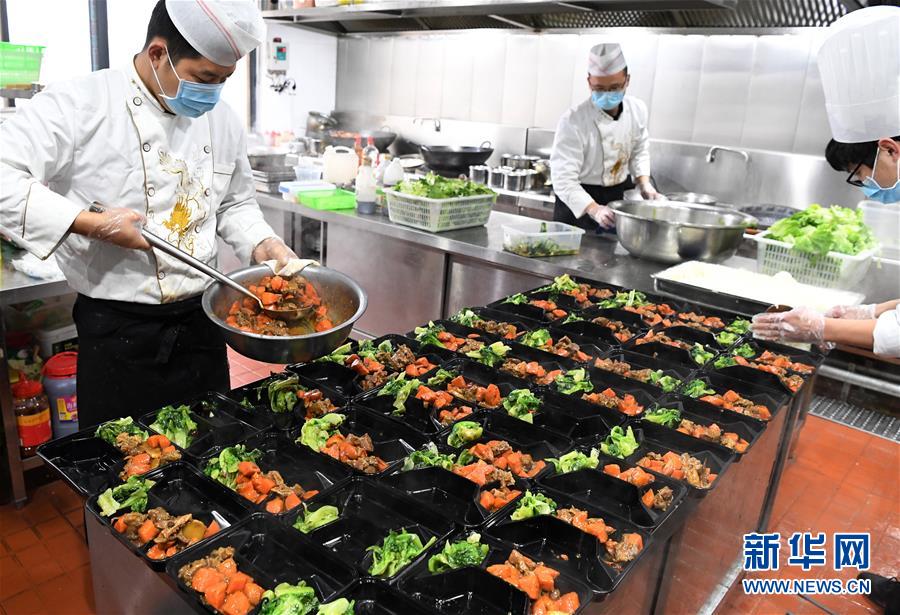 2月6日,厨房工作人员用餐盒分装饭菜。 新华社发(郝源 摄)