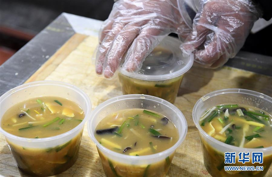 2月6日,厨房工作人员在打包酸辣汤。新华社发(郝源 摄)