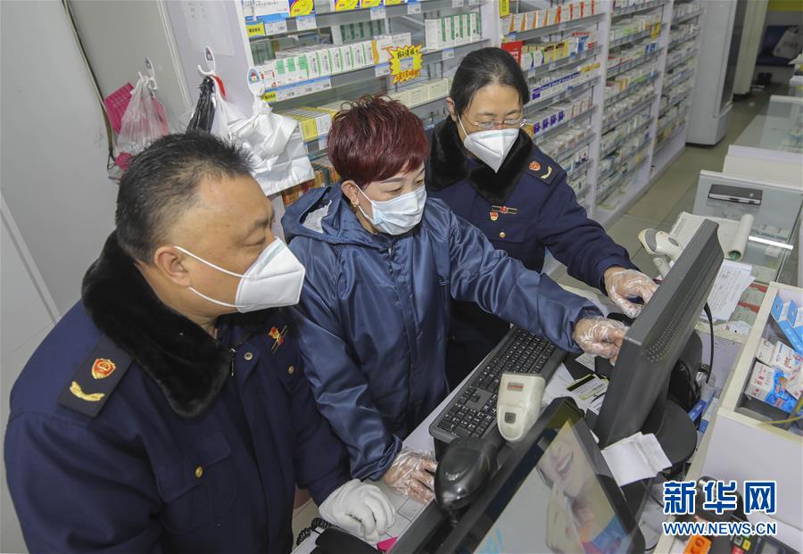 2月6日,山东省临沂市兰山区银雀山街道红旗路一家药店内,市场监督管理所执法人员通过电脑查看店内销售流水账目。 在新型冠状病毒感染的肺炎疫情防控过程中,山东省各地加大对口罩、消毒水、抗病毒类药品等医药用品的市场监管,严厉打击疫情期间哄抬物价、制假售假等违法行为。 新华社发(许传宝 摄)