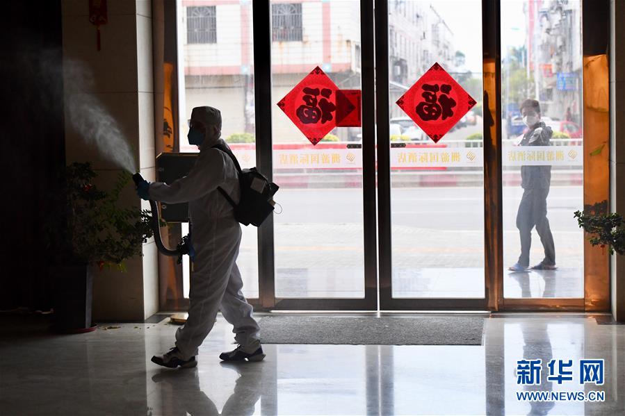 2月6日,福建省晋江市安海镇健康管理中心聘请的专业消毒人员在对一处酒店大堂进行消毒作业。新华社记者姜克红摄