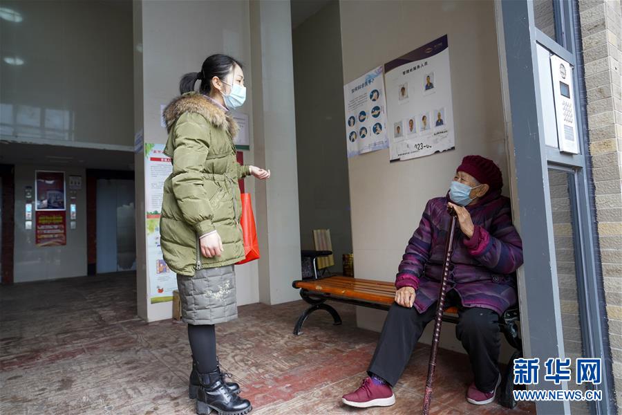 2月6日,汪芮在和庆家园小区内劝导一名老奶奶在疫情防控期间少出门。新华社记者 刘潺 摄