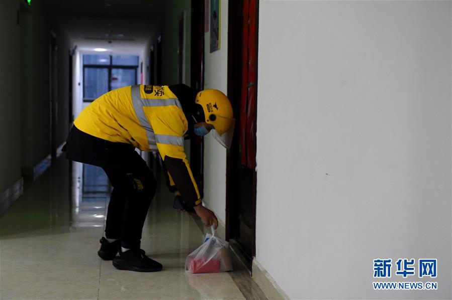 2月6日,在合肥市包河区一栋公寓楼内,为减少人与人接触,徐发祥将外卖放在顾客家门口,让顾客自取。新华社发 (周牧 摄)