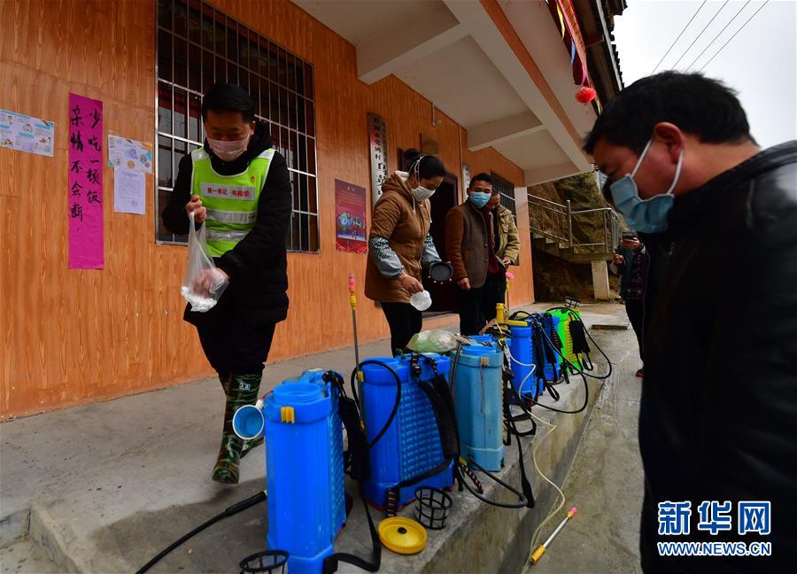 在广西柳州市融水苗族自治县杆洞乡党鸠村乌英苗寨,驻村第一书记韦桂华(左一)和村民在调配消毒药水,准备给苗寨消毒(2月5日摄)。 新华社记者 黄孝邦 摄