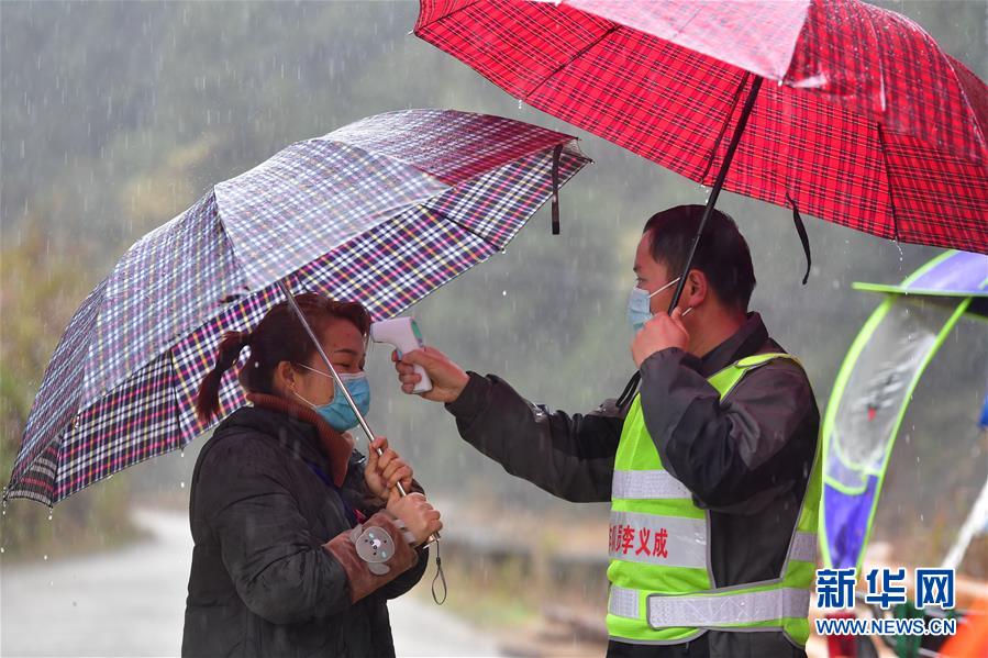 在广西柳州市融水苗族自治县杆洞乡尧告村疫情防控检测点,扶贫工作队员李义成(右)给过往人员测量体温(2月6日摄)。 新华社记者 黄孝邦 摄