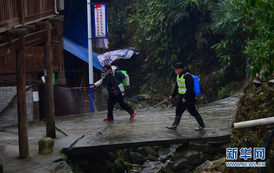 在广西柳州市融水苗族自治县杆洞乡党鸠村乌英苗寨,驻村第一书记韦桂华(右)和村支书梁成张在喷洒消毒药水(2月5日摄)。 新华社记者 黄孝邦 摄