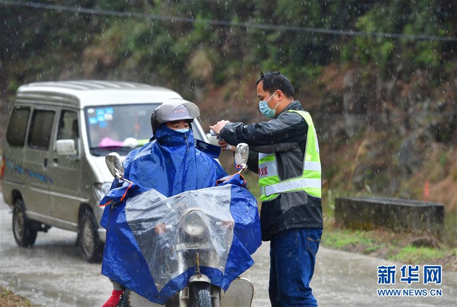 在广西柳州市融水苗族自治县杆洞乡尧告村疫情防控检测点,扶贫工作队员李义成(右)给过往人员测量体温(2月6日摄)。 新华社记者 黄孝邦 摄