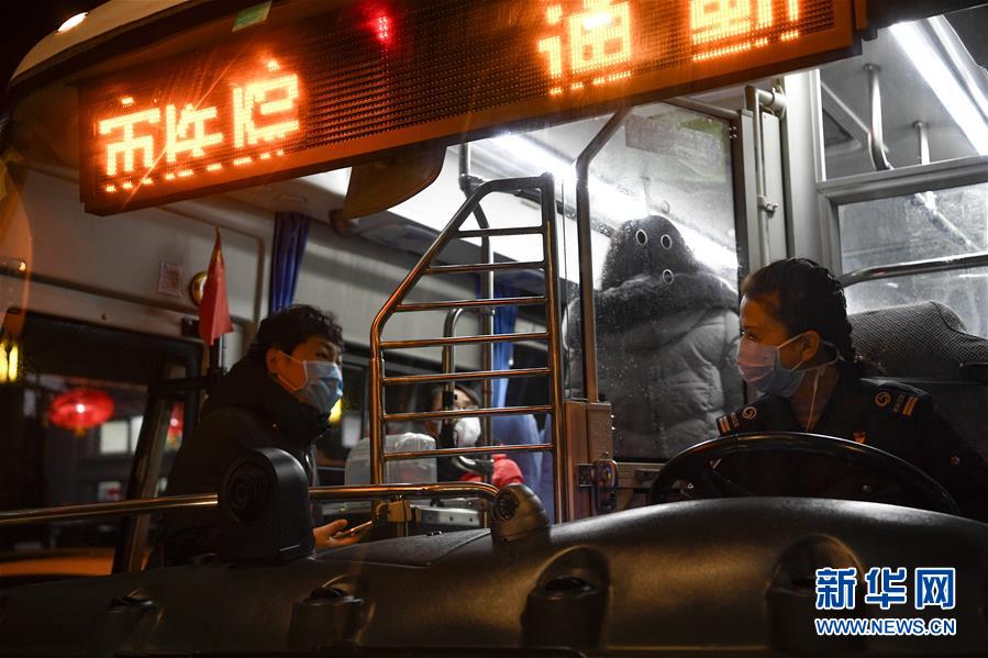 2月7日,到达接送医护人员的站点后,陈丽萍(右一)与上车的乘客相互问候。新华社记者 冯开华 摄