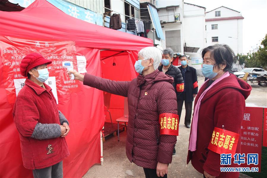 2月7日,南昌青山湖区湖坊镇湖坊村党员志愿者为村民测量体温。 为做好新型冠状病毒感染的肺炎疫情防控工作,近期,江西省南昌市青山湖区加强辖区内各个社区、街道的防疫管理工作,落实重点区域卫生消毒、出入社区人员车辆排查、生活物资保障、动态体温检测等多项措施,做到早发现、早诊断、早隔离、早治疗。 新华社记者 胡晨欢 摄