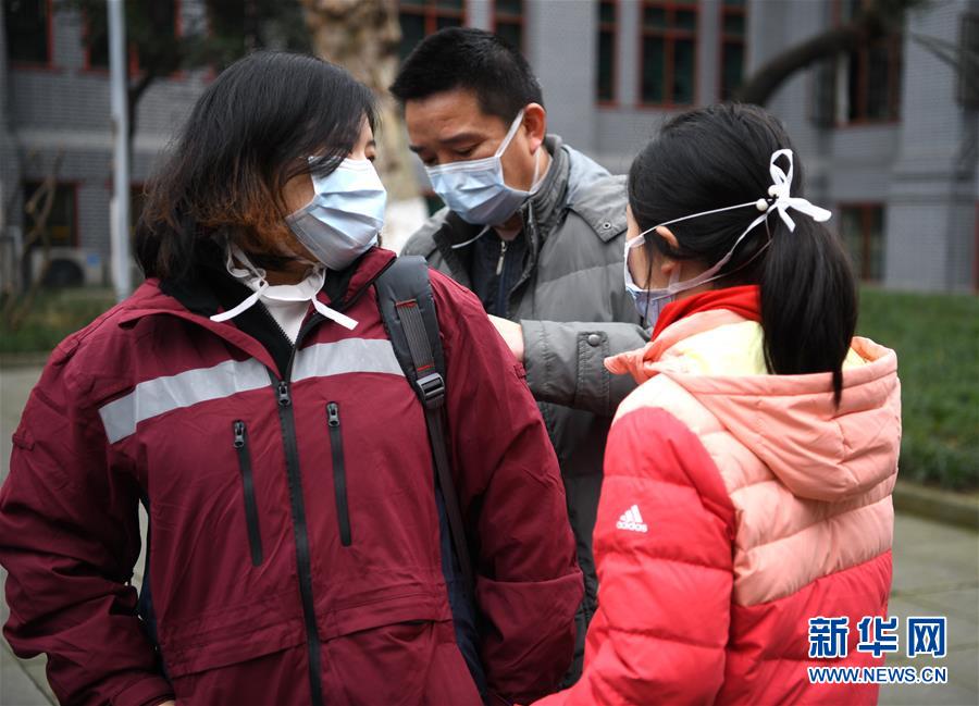 2月7日,在四川大学华西医院,家属检查即将出征的医疗队队员的背包。 当日,四川省第五批援助湖北医疗队出征。四川大学华西医院共派出131人的医疗队驰援武汉,作为国家支援湖北抗疫医疗队赴武汉开展救治工作。 新华社发(王曦 摄)