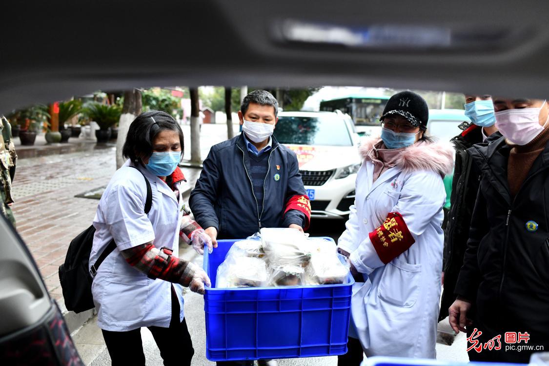 2020年2月6日,贵州省遵义市爱心餐饮企业每天要制作1000余份爱心快餐,几十个志愿者往返奔跑在各疫情监测点之间,及时将热气腾腾的饭菜送到各监测点上的工作人员手上,为疫情防控提供了后勤保障。(娄明华摄/光明图片)