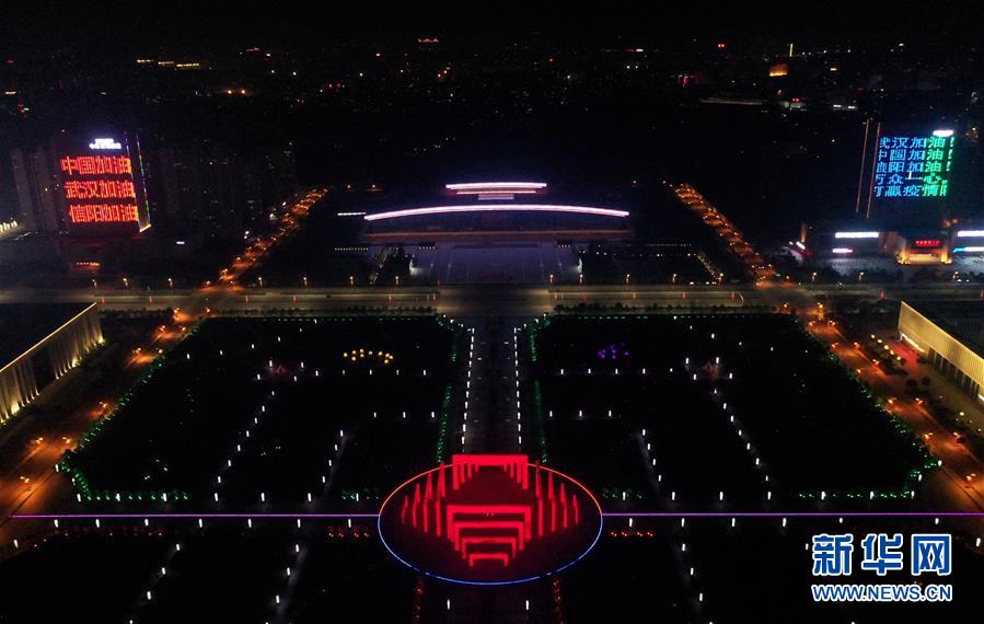 2月8日晚,信阳中乐百花酒店(左)与信阳中乐百花大厦亮起武汉加油等字样(无人机照片)。 当日是元宵节,河南省信阳市部分楼宇用亮灯的方式为武汉加油,为中国加油,为信阳加油。 新华社记者 李嘉南 摄
