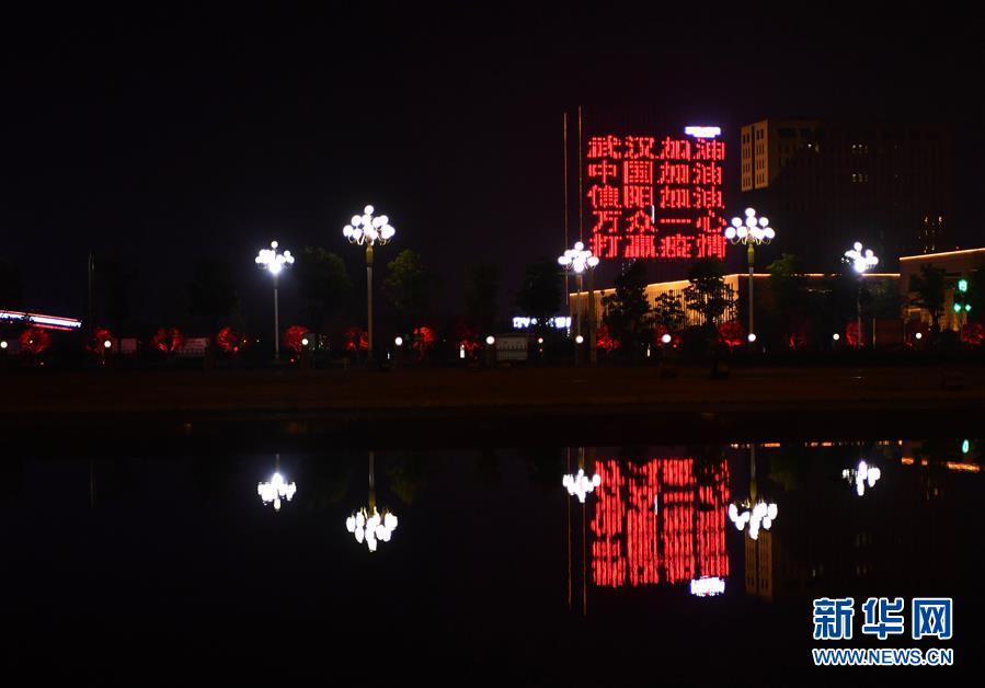 2月8日,信阳中乐百花大厦亮起武汉加油等字样。 当日是元宵节,河南省信阳市部分楼宇用亮灯的方式为武汉加油,为中国加油,为信阳加油。 新华社记者 李嘉南 摄