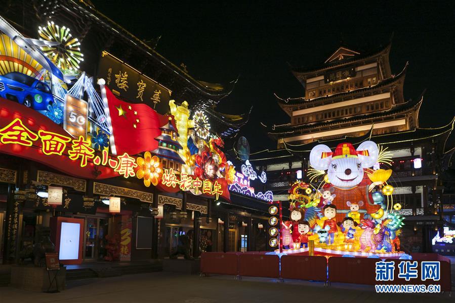 2月8日晚,上海豫园点亮彩灯。 当日是元宵节,上海豫园推出“云赏灯”,通过线上互动,让网友在线上观看豫园灯会。 新华社发 (王翔 摄)