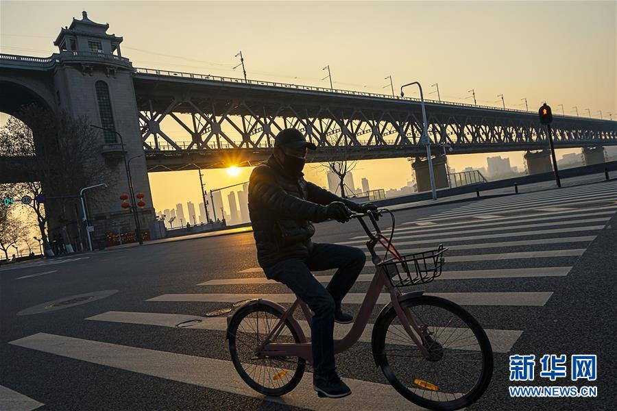 2月4日,一名市民在武汉长江大桥附近骑车。新华社记者 熊琦 摄