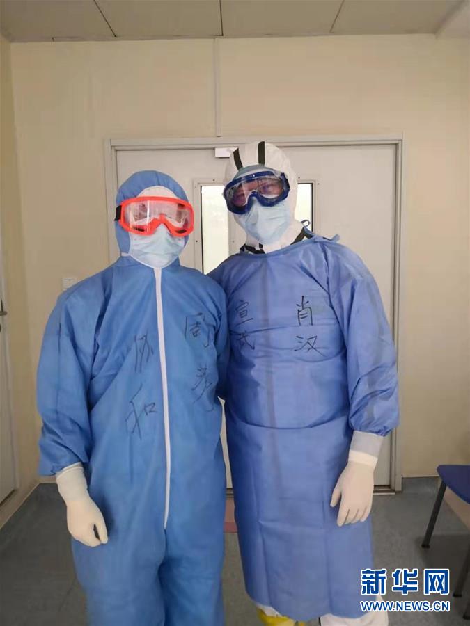 2月8日,首都医科大学宣武医院呼吸内科副主任肖汉(右)在武汉协和医院与同事在一起。新华社发