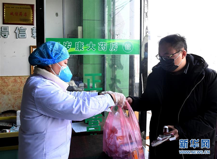 2月8日,在河南省邓州市孟楼镇一家药店,工作人员把药品递给顾客。 河南省邓州市孟楼镇地处鄂豫交界地区。新冠肺炎疫情发生后,当地政府积极采取多种措施,保障农副产品、医药物资的日常供应。记者走访发现,当地居民分时段错峰采购,生活井然有序。 新华社发(郝源 摄)