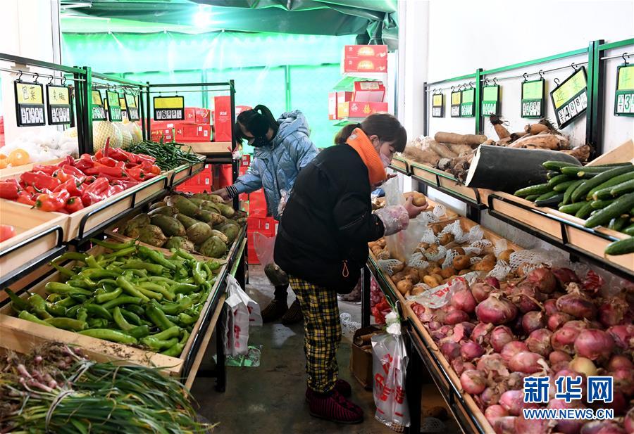 2月8日,在河南省邓州市孟楼镇一家超市,当地居民在选购蔬菜。 河南省邓州市孟楼镇地处鄂豫交界地区。新冠肺炎疫情发生后,当地政府积极采取多种措施,保障农副产品、医药物资的日常供应。记者走访发现,当地居民分时段错峰采购,生活井然有序。 新华社发(郝源 摄)