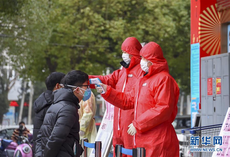 2月8日,孝感市民在进超市购物前接受体温检测。新华社记者 胡虎虎 摄