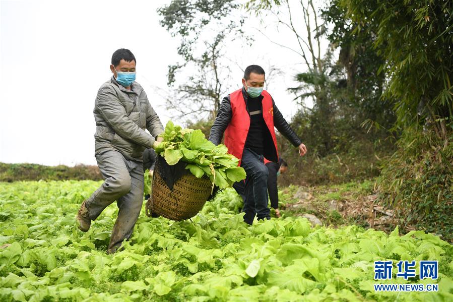 2月8日,菜农(左)和乡村蔬菜配送小队志愿者在搬运蔬菜。 新华社记者 唐奕 摄