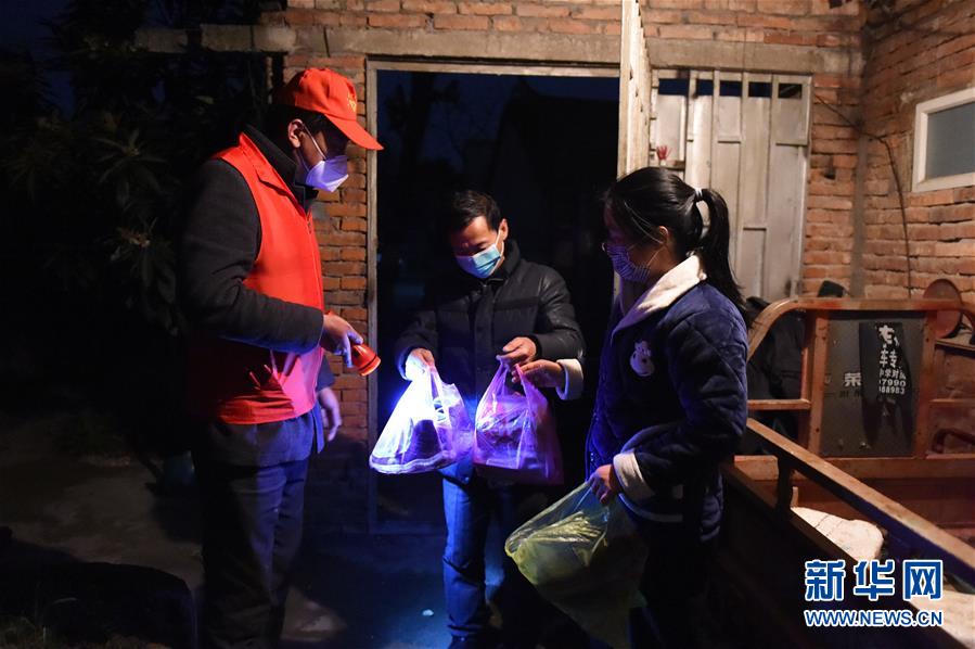 2月8日,在肥东县长临河镇四顶社区,志愿者杨静波(左)将生活物资运送到村民家中。 新华社发(周牧摄)