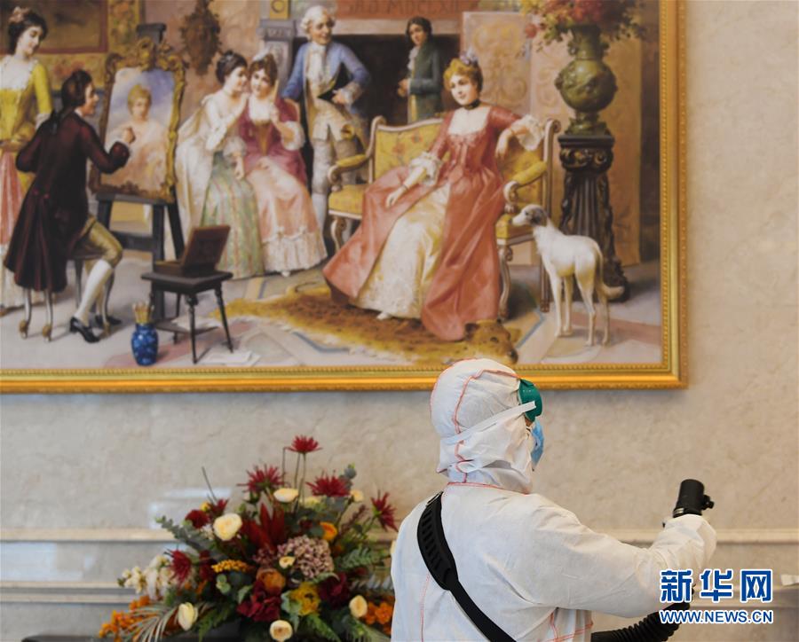 2月7日,工作人员对温州市瓯海区茶山街道一家酒店改造成的隔离点进行例行消毒。 从2月2日到8日,新华社记者连续驻守温州7天,见证了这座近千万人口城市,干部群众如何合力抗击疫情。过了元宵节,告别春节,还将在春天里继续坚守,直至打赢这场疫情。 新华社记者 翁忻旸 摄
