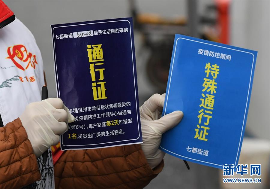 2月6日,工作人员在温州市鹿城区七都街道上沙村村口展示人员进出须持有的两种通行证。 从2月2日到8日,新华社记者连续驻守温州7天,见证了这座近千万人口城市,干部群众如何合力抗击疫情。过了元宵节,告别春节,还将在春天里继续坚守,直至打赢这场疫情。 新华社记者 翁忻旸 摄