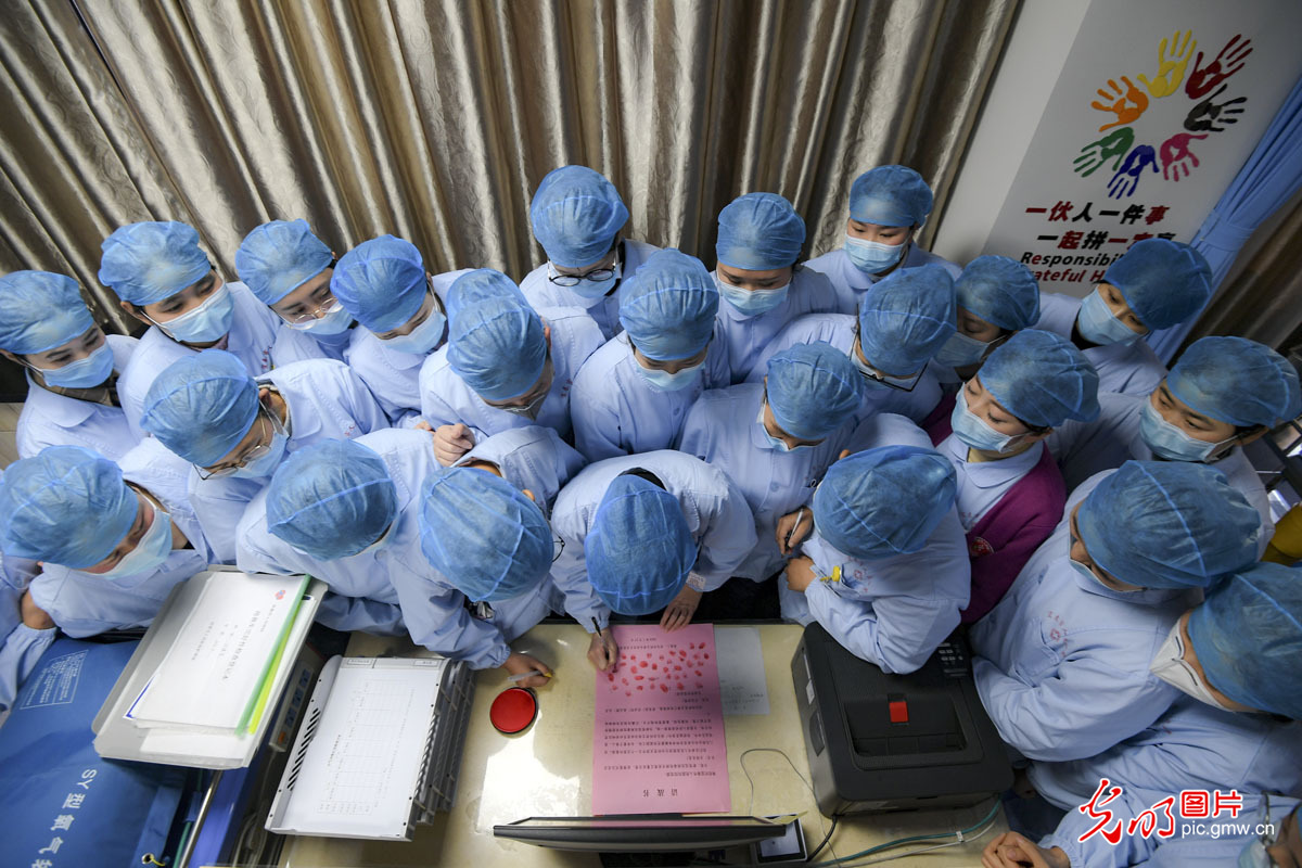 2020年1月30日,江西省宜春市人民医院医护人员在扩充整理隔离病房。(袁剑波 摄/光明图片)