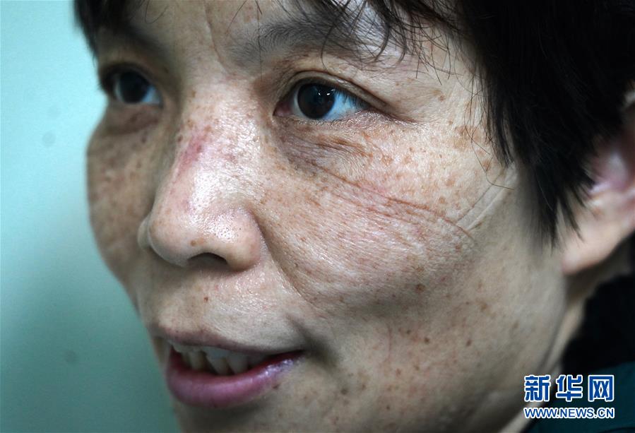 这是南昌大学第一附属医院重症医学科护士长江榕脸上被护目镜和口罩压出的印痕(2月6日摄)。 新华社记者 万象 摄