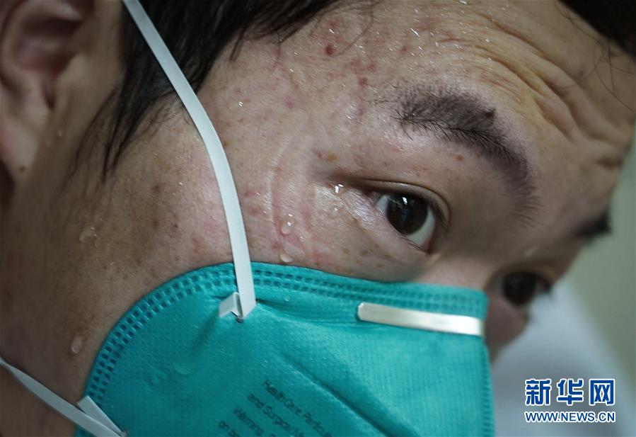 这是南昌大学第一附属医院象湖院区隔离病房重症监护室值班护士汤凌鹏脸上被护目镜压出的印痕和汗水(2月6日摄)。 新华社记者 万象 摄
