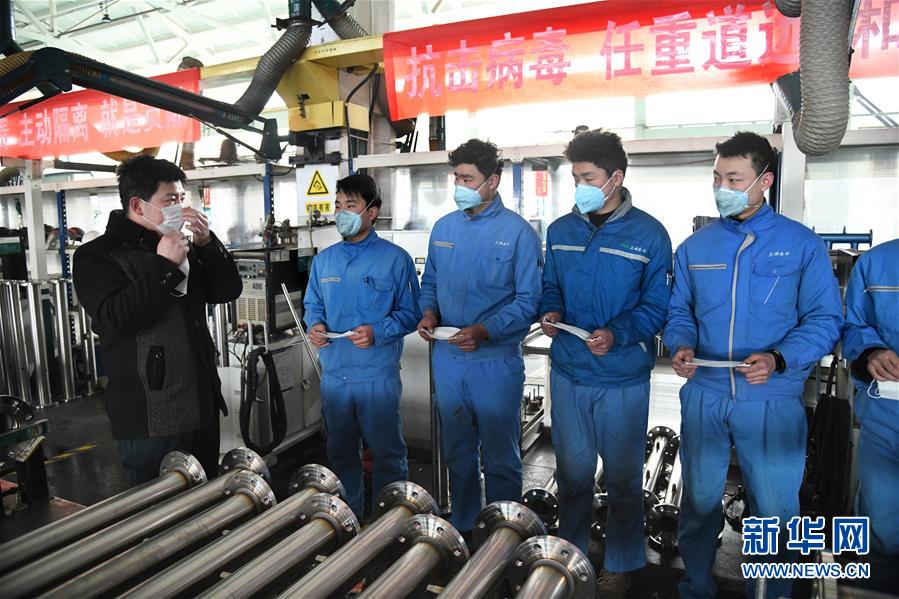 2月9日,青岛城阳区一企业对工人进行防疫培训,为复工复产做准备。 新华社记者 李紫恒摄