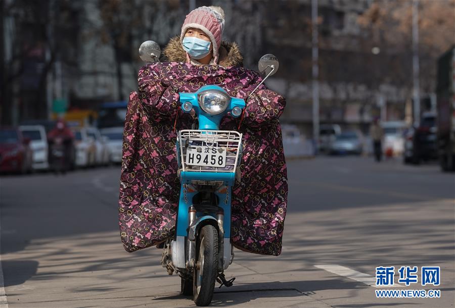2月9日,一位市民骑车经过武汉市江岸区花桥街道。 新华社记者 程敏 摄