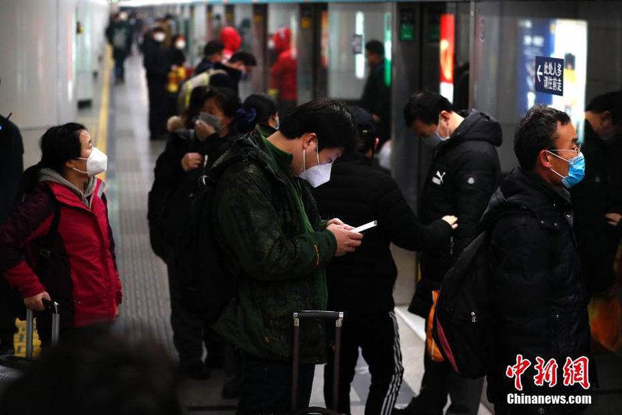 抵达北京南站的返京旅客准备乘坐轨道交通离站。中新社记者 富田 摄