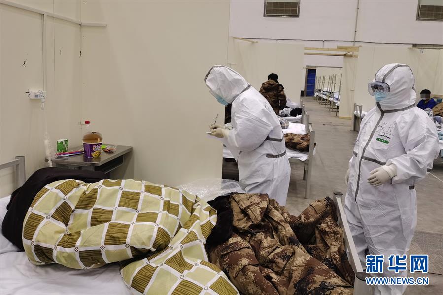 邢远方(右三)在急诊抢救室内为病人做心电图检测(2月9日摄)。