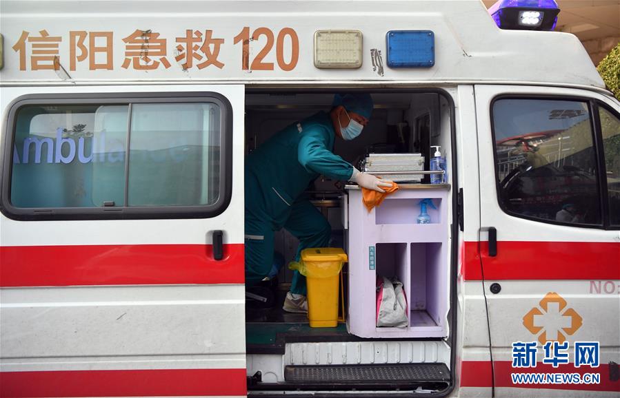 邢远方在擦拭救护车内部,防止交叉感染(2月9日摄)。新华社记者李嘉南摄