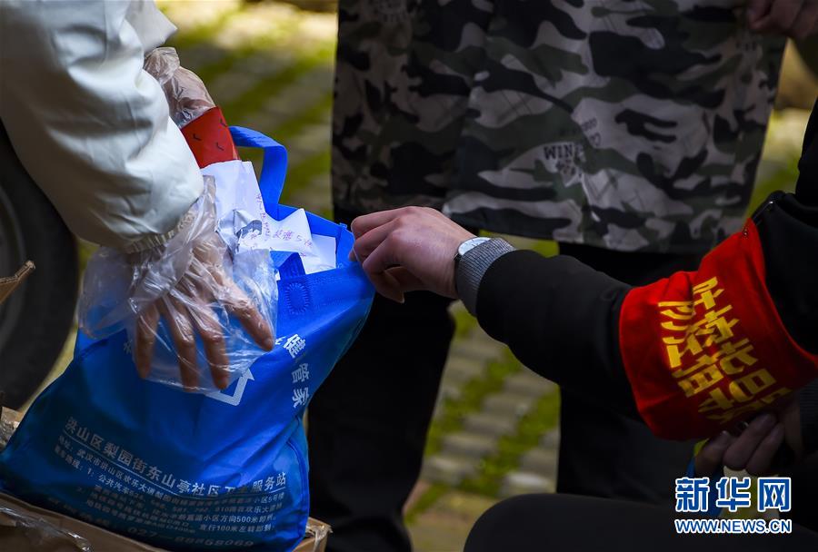 2月9日,一位拨打“96120”的市民把需要转交给家人的物品交给前来帮助的社区疫情防控指导员秦兴辉。新华社记者 胡虎虎 摄