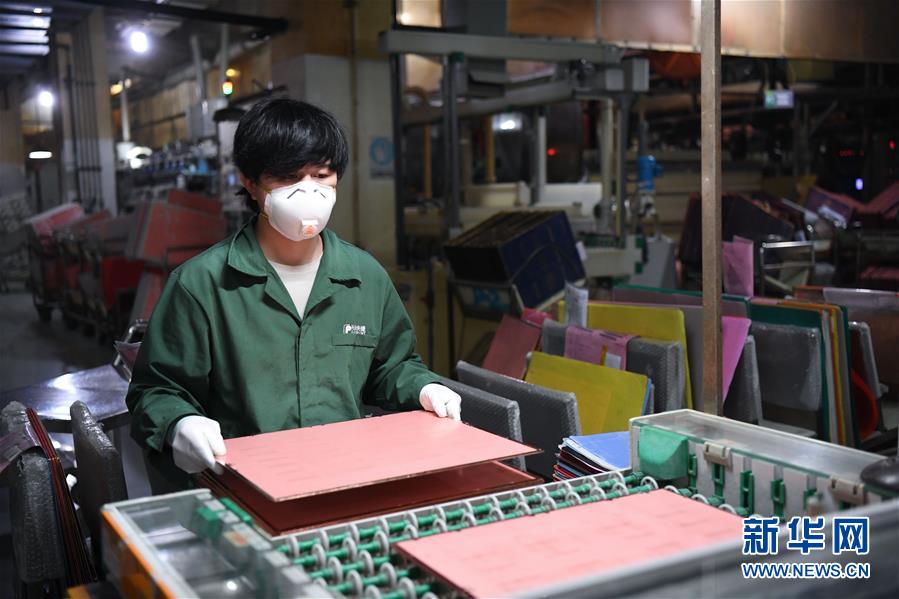 2月10日,位于广州开发区的广州兴森快捷电路科技有限公司生产车间内,工人佩戴口罩作业。 近日,在做好防控新冠肺炎疫情工作的同时,全国许多企业开始复工复产。 新华社记者 邓华 摄