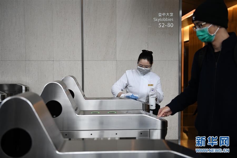 2月10日,在深圳第一高楼、位于福田CBD的平安国际金融中心,保洁人员在对刷卡闸机进行消毒。 近日,在做好防控新冠肺炎疫情工作的同时,全国许多企业开始复工复产。 新华社记者 梁旭 摄