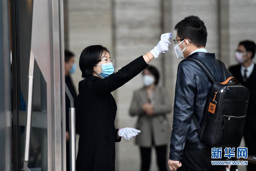 2月10日,在深圳第一高楼、位于福田CBD的平安国际金融中心,工作人员为进入写字楼的人员测量体温。 近日,在做好防控新冠肺炎疫情工作的同时,全国许多企业开始复工复产。 新华社记者 梁旭 摄