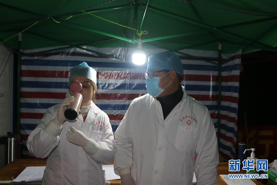 2月9日深夜11点半左右,陈燕梅趁着工作间隙,喝一口丈夫李健晖带来的红糖水。 新华社发(廖伟 摄)