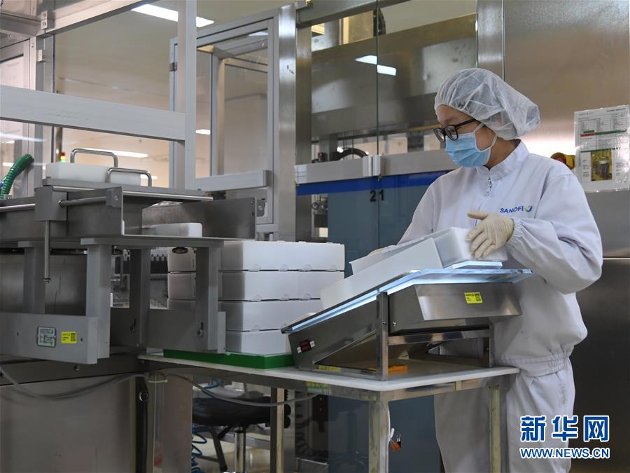 2月10日,赛诺菲(北京)制药有限公司员工对生产线上的甘精胰岛素注射液进行目检。 新华社发(任超 摄)