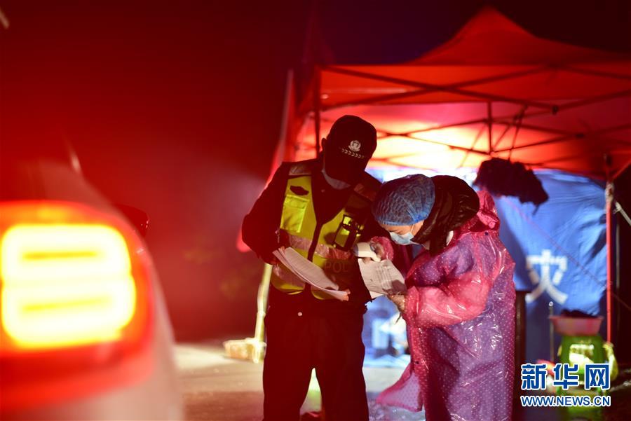 2月10日晚,在贵州省黔东南苗族侗族自治州丹寨县排调镇孔庆村新冠肺炎疫情防控卡点,工作人员在核查车辆和司乘人员信息。 地处贵州省大山深处的黔东南苗族侗族自治州丹寨县排调镇为打好新冠肺炎疫情防控阻击战,全镇设置57个疫情防控卡点,严格实行24小时轮班制,夜不撤岗,全力保障山区群众的安全。 新华社发(杨武魁 摄)