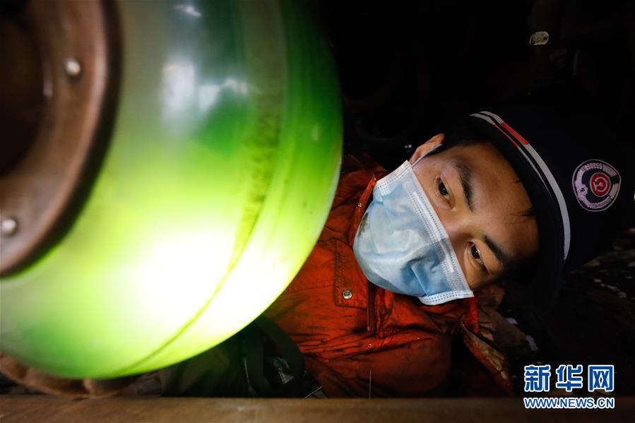 在江西上饶站,工作人员对“巡检大篷车”车厢底部的高精度探伤轮进行检测维护保养(2月10日摄)。 随着全国各地人员陆续返岗复工,铁路部门也将陆续迎来返程客流高峰。近日,江西鹰潭工务机械段“巡检大篷车”上的工作人员开始了疫情防控特殊时段的忙碌生活。江西鹰潭工务机械段主要负责赣、闽两省普速和高速铁路铁轨的探伤巡检工作,由于常年在外作业,工作人员在由火车车厢改造成的宿营车上工作,他们工作的宿营车也被称为铁路上的“巡检大篷车”。为确保疫情期间铁路运输安全,工作人员除了做好自身防护,还要克服水电短缺、远离家人等困难,他们在“巡检大篷车”上坚守岗位,全力保障旅客安全出行。 新华社记者胡晨欢摄