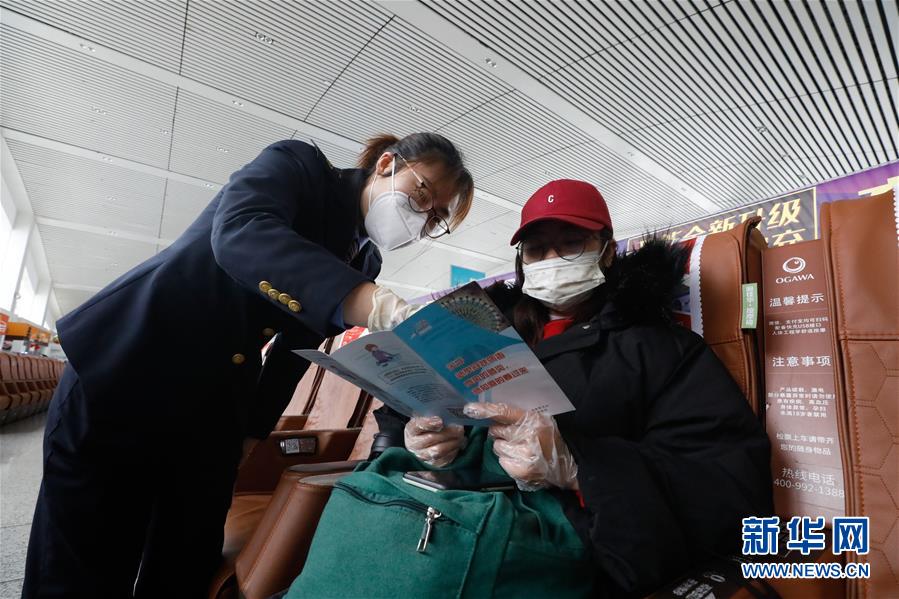 2月11日,上饶火车站工作人员为旅客发放防疫知识传单并进行防疫提示。 随着返程客流增长,江西上饶火车站进一步加强对新冠肺炎疫情的防控,根据车次信息优化旅客候车区域、减少人员聚集,同时细致做好进出站旅客体温检测、健康信息登记和防疫宣传等工作,保障旅客安全有序出行。 新华社记者 胡晨欢 摄